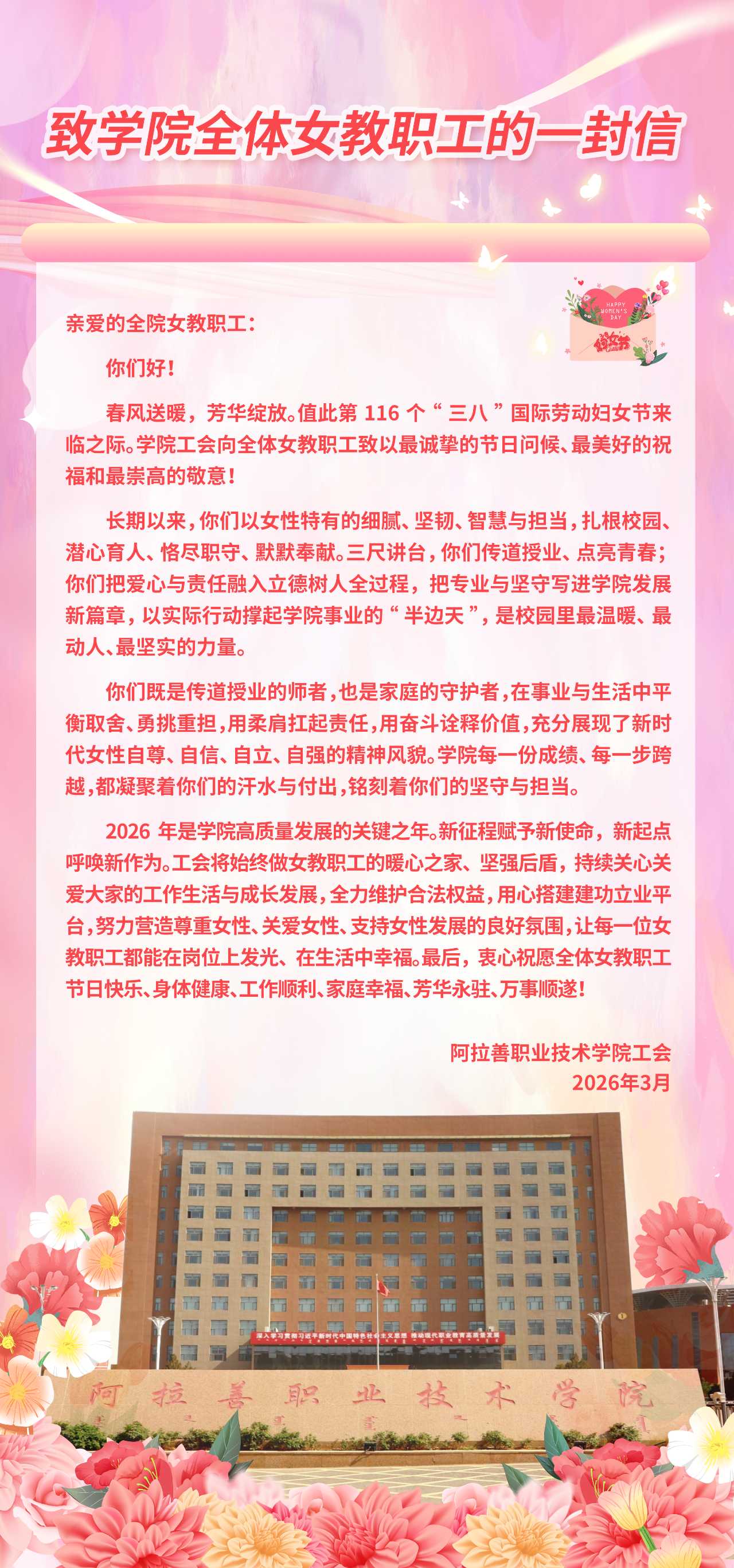 阿拉善职业技术学院工会“三八”妇女节致全院女教职工的慰问信