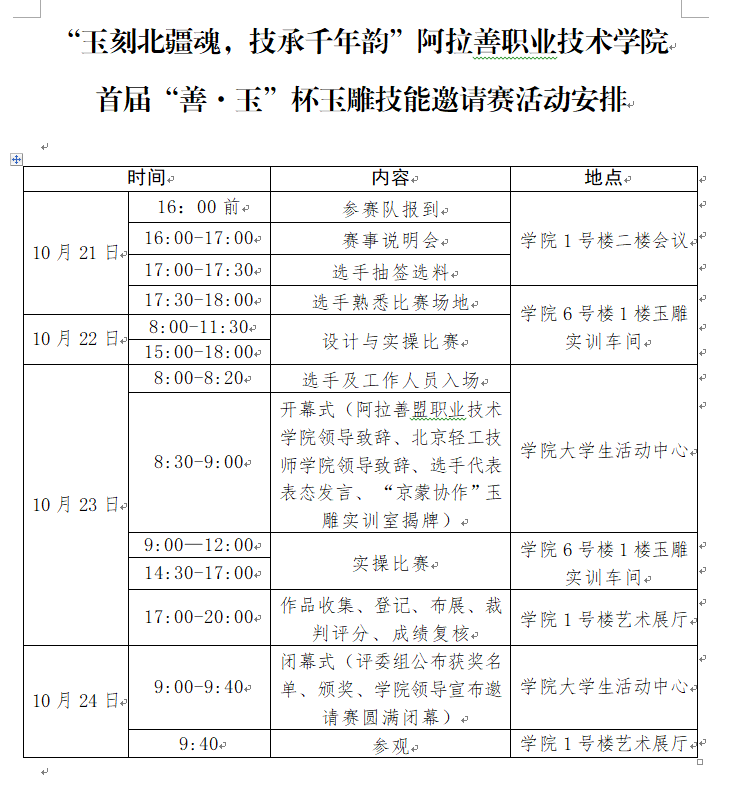 为进一步深化京蒙协作内涵,推动玉石行业高质量发展,将传统玉雕技艺与现代职业教育、文化创意产业紧密结合,持续深化“以赛促学、以赛促训、以赛促创”模式,为玉雕行业培养高素质技术技能人才,同时为北疆文化的创造性转化与创新性发展注入新动能,阿拉善职业技术学院、北京轻工技师学院(北京乐器研究所)、阿拉善盟工会、阿拉善盟人力资源和社会保障局于10月21日至24日联合举办首届“玉刻北疆魂,技承千年韵”阿拉善盟“善·玉”杯玉雕技能邀请赛。活动开幕式定于10月23日上午9:00在阿拉善职业技术学院大学生活动中心举行,特此公告。