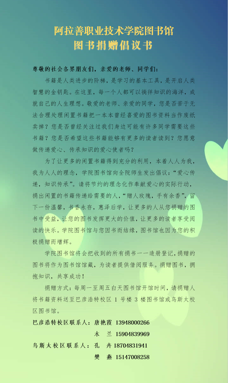 阿拉善职业技术学院图书馆图书捐赠倡议