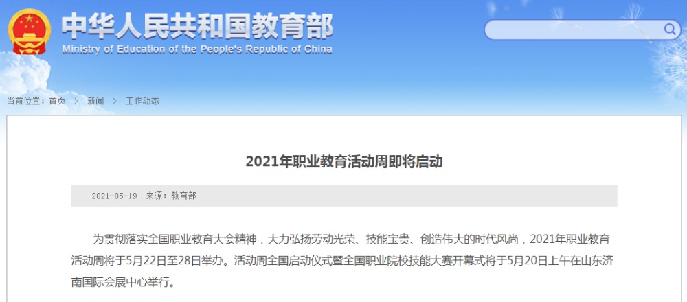 2021年职业教育活动周将于5月22日至28日举办。活动周全国启动仪式暨全国职业院校技能大赛开幕式于5月20日上午在山东济南国际会展中心举行。