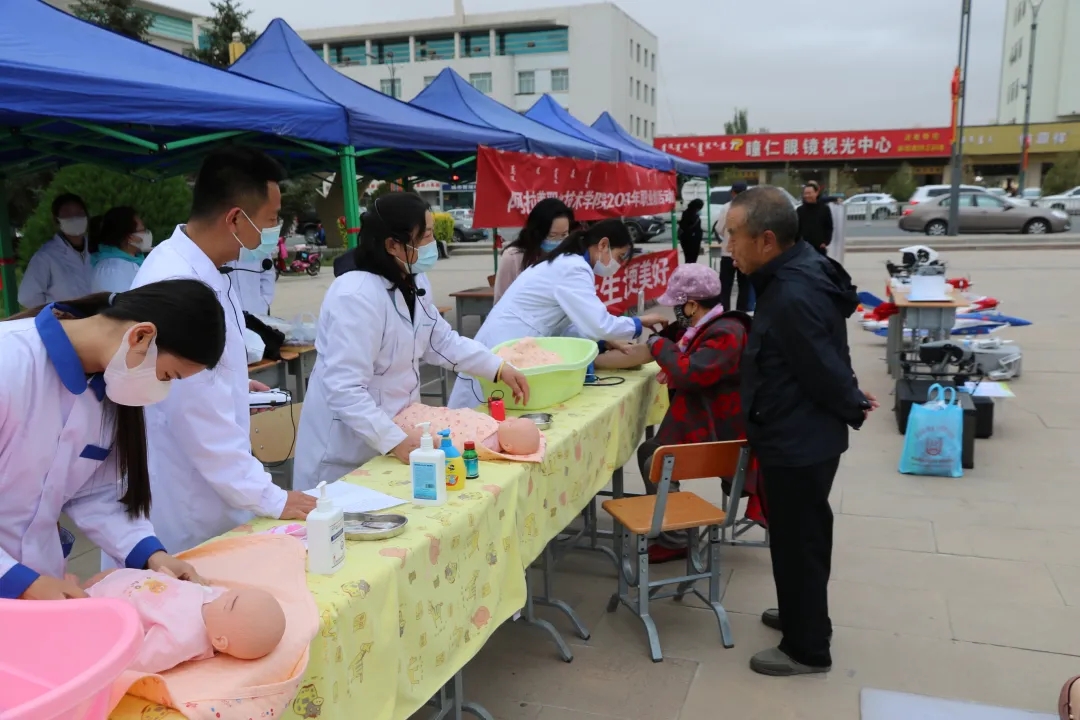 医疗护理系师生开展了义诊服务,并宣传了疫情防控和卫生健康知识。他们在现场为本地居民测血压、颈椎康复按摩,并针对检查情况,进行一对一的健康咨询解答。还用模拟人进行了心肺复苏急救演示,用模拟幼儿进行了幼儿护理演示。