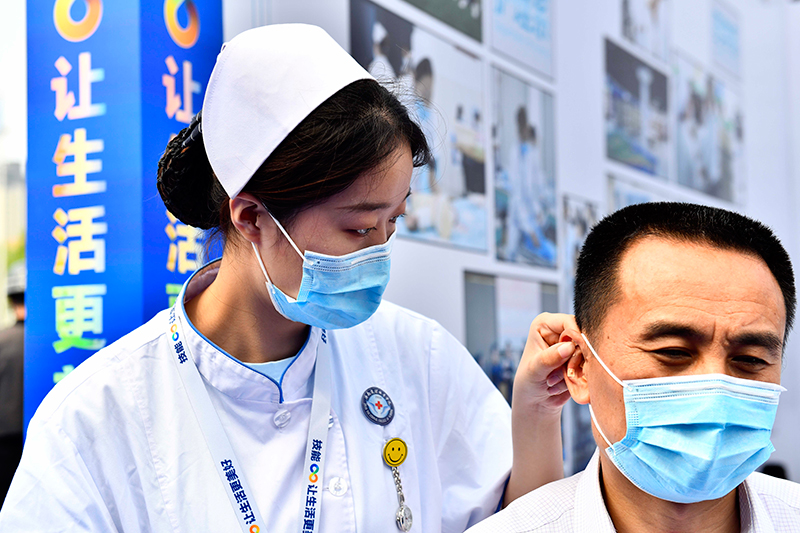 5月20日,在山东国际会展中心,济南护理职业学院学生进行耳穴压豆技能展示。