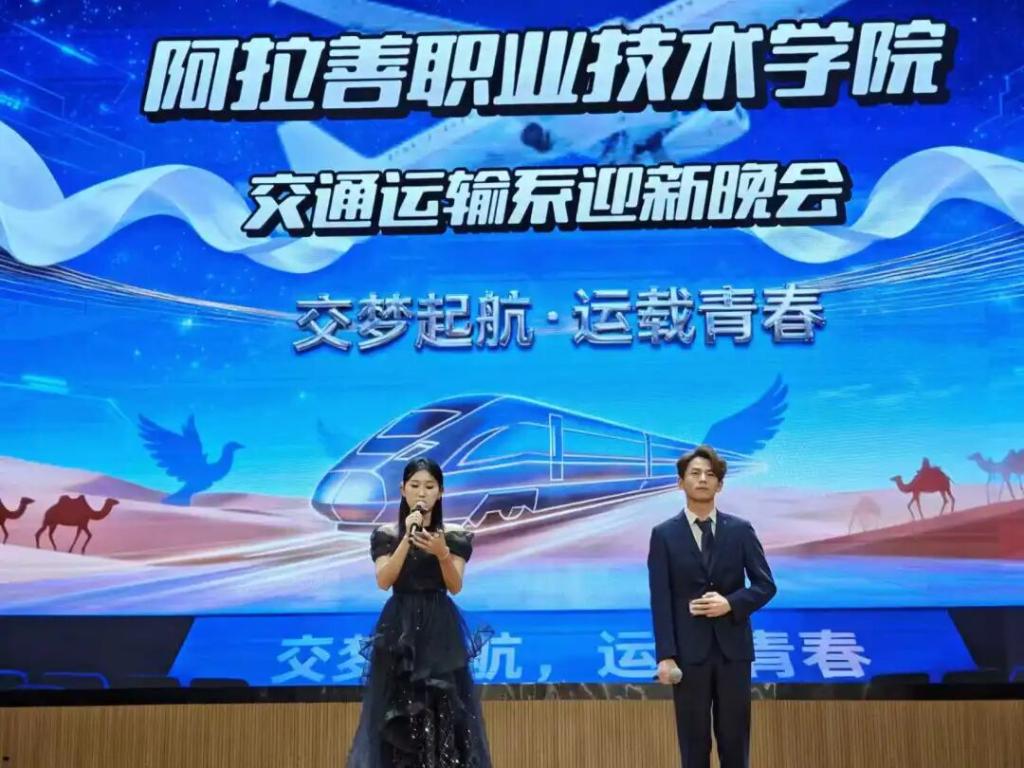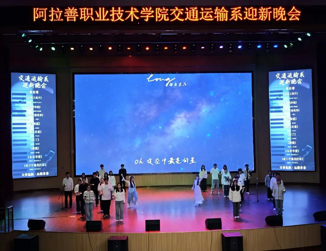 晚会舞台背景巧妙融合高铁、飞机等交通元素与阿拉善沙漠驼队地域符号,让活动主题具象而动人。《出现又离开》的深情演唱,《舞蹈串烧》的动感演绎,《本草华裳》在传统服饰秀中展现文化底蕴,《青海摇》在魔性舞步中引发阵阵欢笑。全体演职人员与新生合唱《夜空中最亮的星》,将晚会推向励志高潮。