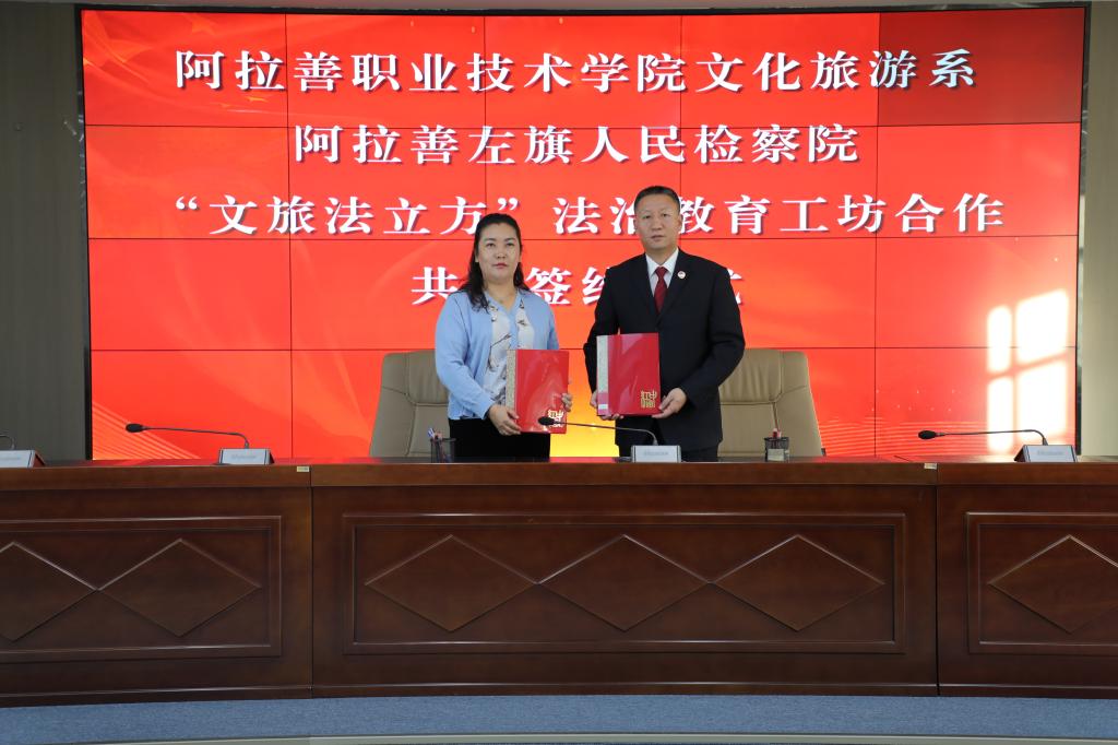 12月3日,文化旅游系与阿左旗人民检察院举行“文旅法立方”法治教育工坊合作共建签约仪式。文化旅游系党总支书记乌尼太、阿左旗人民检察院检察长张军华签署合作协议。“文旅法立方”法治教育工坊的成立,将搭建起检校优势互补、资源共享、协同发展的坚实桥梁,为法治宣传教育高质量发展注入强劲动力。阿左旗人民检察院将提供专业法律支持,包括真实案例库、检察官导师资源及模拟法庭装备;文化旅游系则负责教学组织、阵地建设和...